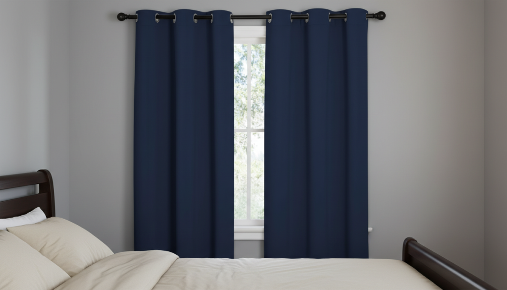 Navy blackout curtains are a sweet spot: darker than gray, softer than pure black, and usually excellent for sleep rooms. Thermal builds tend to hang nicely and block more light.